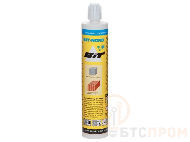 Химический анкер BIT-NORD - двухкомпонентный химический состав на основе синтетической эпокси-акрилатной смолы, не содержащей стирол и не имеющей запаха в сочетании с металлическими анкерными элементами (резьбовыми шпильками, анкерными и фундаментными болтами, арматурными прутками и т.п.). Химические анкеры BIT-NORD специально разработаны для осуществления анкерных креплений в экстремальных условиях северных широт и низких температур (монтаж до -18°С) в тяжелом и легком бетонах, природном камне, различных видах кирпича (керамического и силикатного), в пустотелых материалах. Химический анкер BIT-NORD обладает меньшей вязкостью в сравнении с химическими составами для стандартных температурных режимов, что обеспечивает лёгкое выпрессовывание компонентов из картриджа, последующее их перемешивание и равномерное заполнение отверстий при отрицательных температурах, гарантируя наилучшее связывание и молекулярную адгезию с материалом основания. Содержит специальные компоненты и добавки для ускорения химической реакции, обеспечивающие сокращение времени отверждения, что необходимо при работе в условиях отрицательных температур.