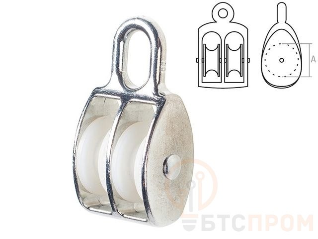 Стальной оцинкованный блок с двумя нейлоновыми кольцами-шкивами применяется для изменения направления движения для неметаллических тросов, веревок и канатов, увеличения силы в грузоподъемном оборудовании.