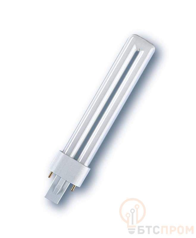 Компактная люминесцентная лампа неинтегрированная OSRAM DULUX S 9Вт с штырьковым одиночным цоколем G23 и однооборотной колбой. Лицензиатом торговой марки OSRAM в общем освещении является компания LEDVANCE.
