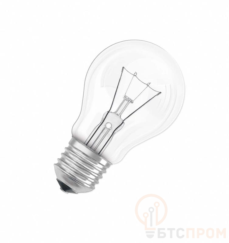 Лампа накаливания OSRAM формы груши 75Вт. Прозрачная колба, цоколь Е27. Лицензиатом торговой марки OSRAM в общем освещении является компания LEDVANCE.