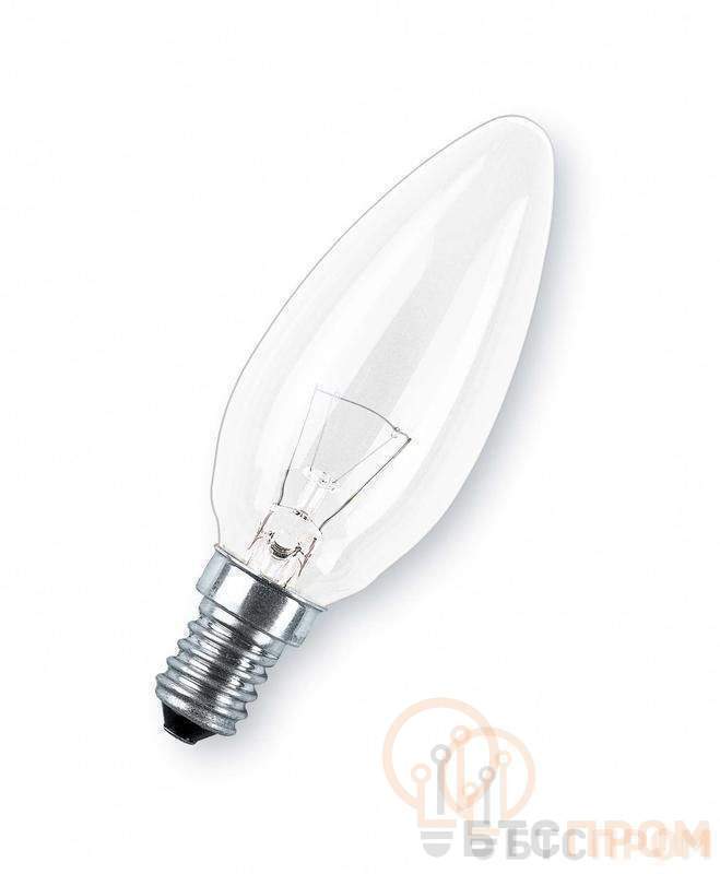 Лампа накаливания OSRAM формы свеча 40Вт. Прозрачная колба, цоколь Е14. Лицензиатом торговой марки OSRAM в общем освещении является компания LEDVANCE.