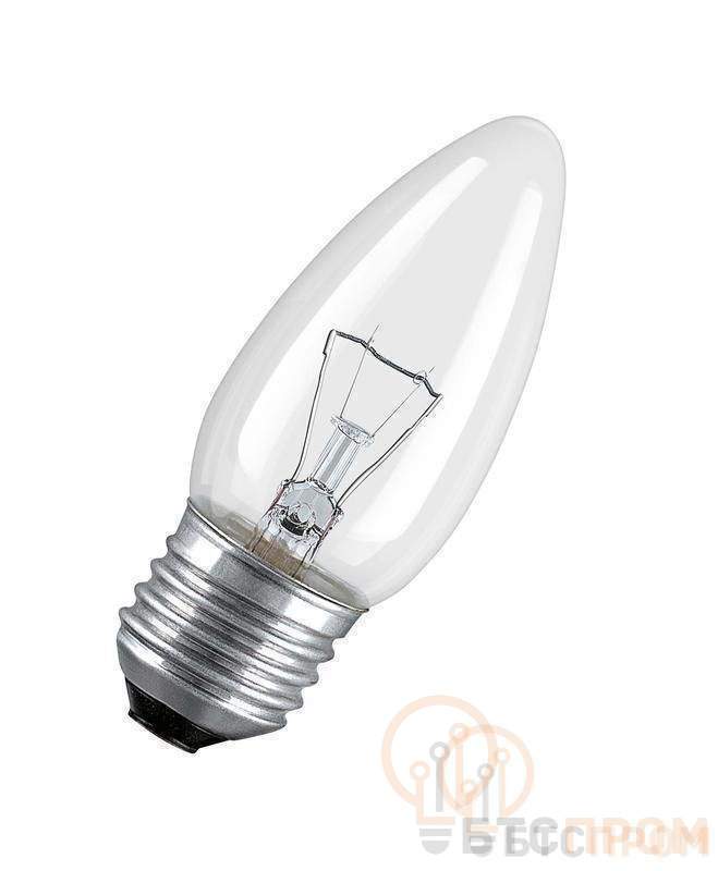 Лампа накаливания OSRAM формы свеча 60Вт. Прозрачная колба, цоколь Е27. Лицензиатом торговой марки OSRAM в общем освещении является компания LEDVANCE.