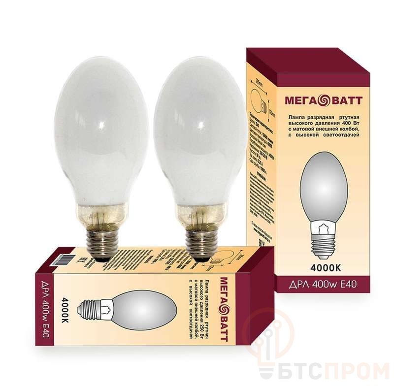 Ртутная лампа ДРЛ 400 E40 МЕГАВАТТ — ртутная лампа высокого давления. Мощность 400Вт, холодный белый свет 4000K, цоколь E40. Для освещения крупных промышленных объектов, спортивных сооружений, магистралей. Высокая надежность и срок службы.