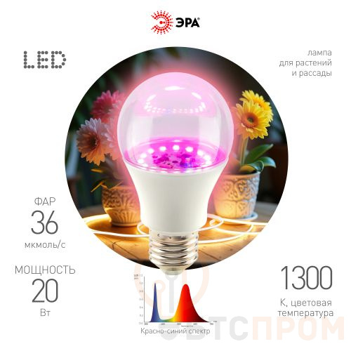 Лампа светодиодная FITO-20W-RB-E27 20Вт грушевидная прозрачная 1300К красн./син. спектра E27 130-270В для растений Эра Б0069710