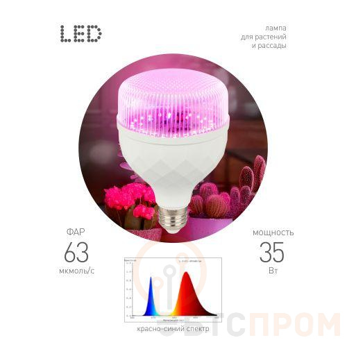 Мощная фитолампа красно-синего спектра — надёжный помощник в выращивании рассады, комнатных цветов, зелени и пасленовых. Создаёт комфортные условия для роста и развития растений, стимулируя набор питательных веществ и рост листьев. Мощность — 35 Вт. Цоколь — Е27. Рекомендуемое расстояние до листьев — 30–60 см. Время освещения — 8–14 часов, с темновой фазой 7 часов. Лампа излучает сбалансированный свет с соотношением синего и красного спектров 1:3, что способствует укреплению стеблей и росту плотных листьев. Использование прозрачного поликарбонатного рассеивателя повышает эффективность светового потока. Лампа является часть линейки ЭРА Green Line, объединившей базовые фитопродукты для профессионального выращивания растений в домашних условиях.