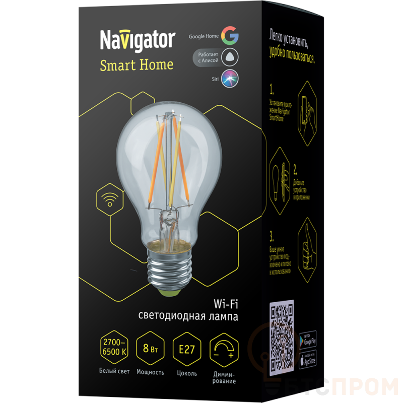 Умная лампа Navigator Smart Home 8Вт A60 E27 Wi-Fi — интеллектуальное устройство для создания современной системы освещения. Управляйте светом со смартфона из любой точки мира: включайте, выключайте, регулируйте яркость и выбирайте из миллионов оттенков белого света (от теплого 2700K до холодного 6500K). Совместима с голосовыми помощниками Алиса и Google Assistant. Лампа подходит для стандартных патронов E27, что позволяет легко модернизировать любую люстру или бра. Создавайте сцены и расписания для автоматизации домашнего освещения.