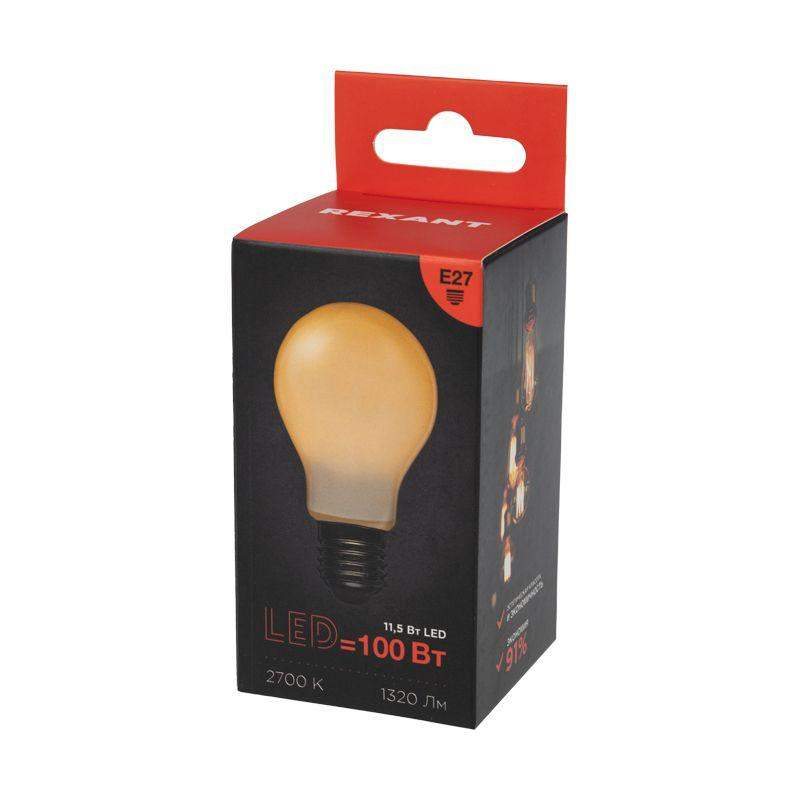 Филаментная лампа Rexant 604-078 в форме груши A60. Мощность 11.5Вт, световой поток 1320лм. Теплый свет 2700К. Матовая колба обеспечивает мягкое рассеивание. Цоколь E27. Универсальная лампа для everyday использования в жилых и коммерческих помещениях.