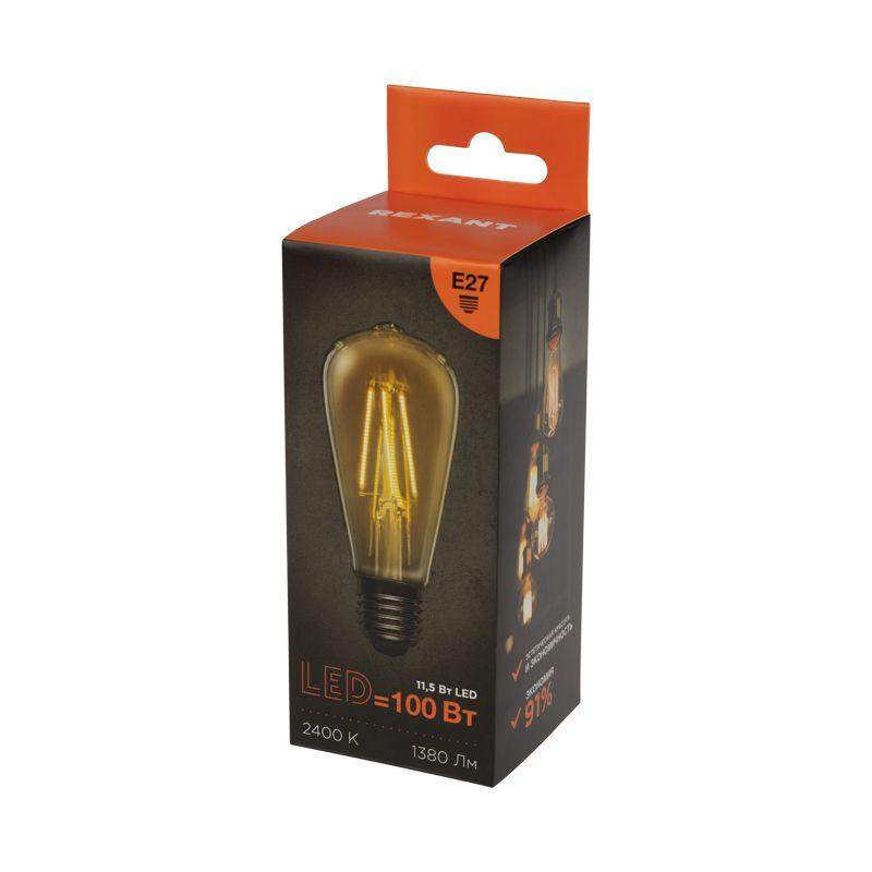 Филаментная лампа Rexant 604-141 в форме ST64 (винтажная груша). Мощность 11.5Вт, световой поток 1380лм. Теплый свет 2400К. Золотистая колба. Цоколь E27. Идеальна для светильников в стиле ретро, лофт, кантри.