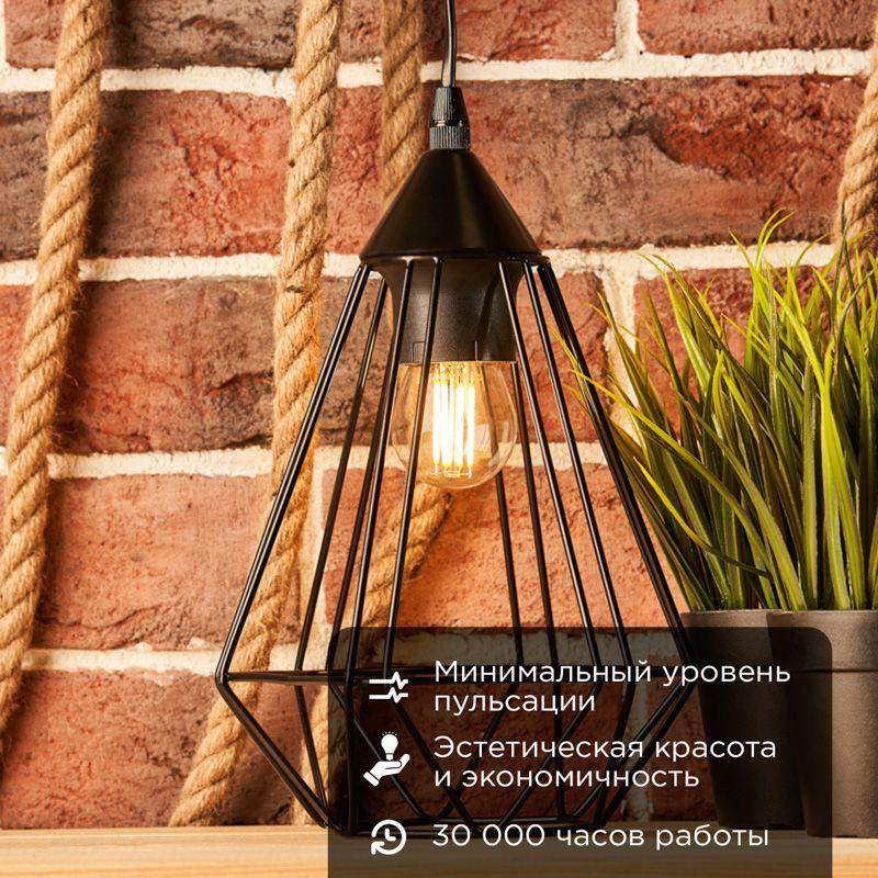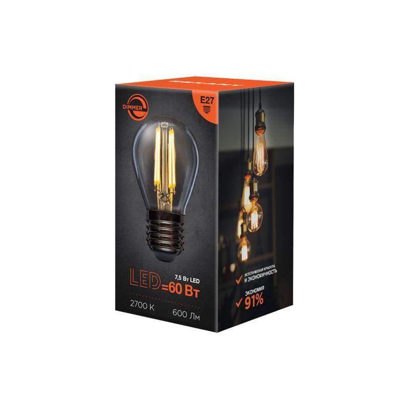 Филаментная лампа Rexant 604-127 в форме шарика GL45. Мощность 7.5Вт, световой поток 600лм. Теплый свет 2700К. Диммируемая. Прозрачная колба. Цоколь E27. Универсальная диммируемая лампа-шар.