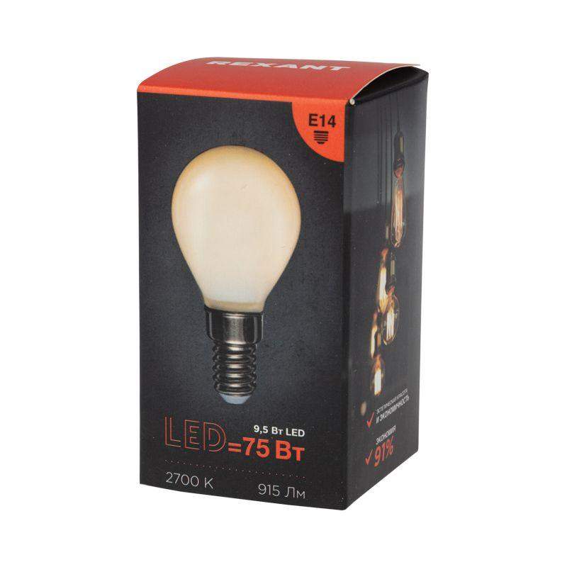 Филаментная лампа Rexant 604-133 в форме шарика GL45. Мощность 9.5Вт, световой поток 915лм. Теплый свет 2700К. Матовая колба. Цоколь E14. Мягкое освещение для создания комфортной атмосферы.