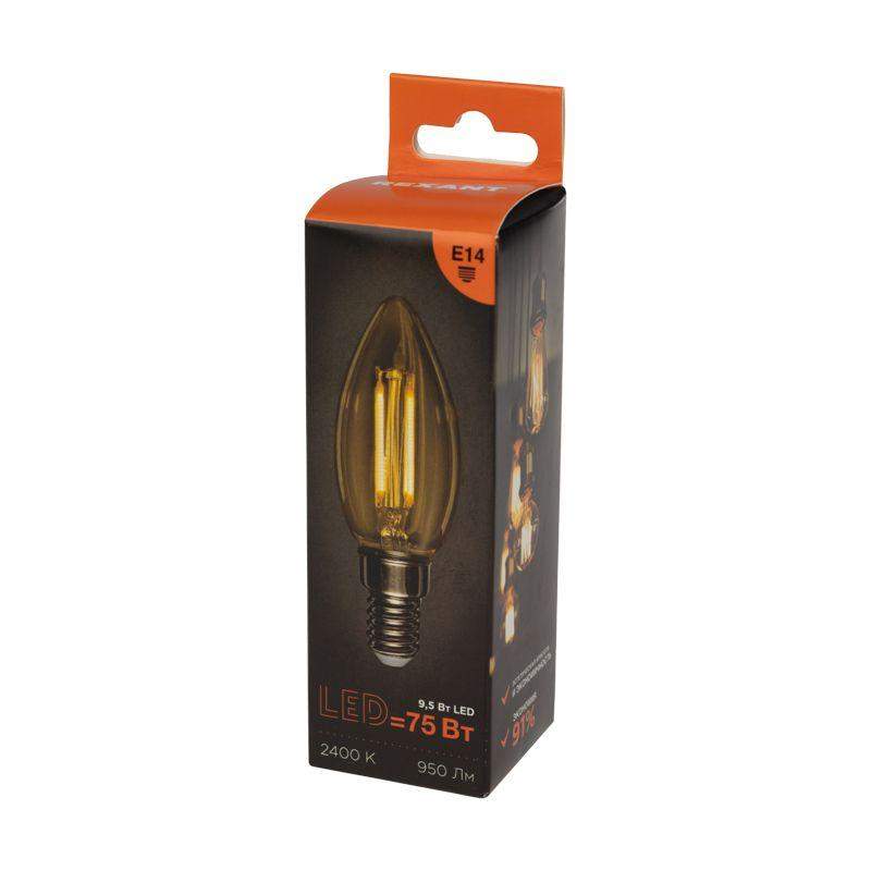 Филаментная лампа Rexant 604-099 в форме свечи CN35. Мощность 9.5Вт, световой поток 950лм. Теплый свет 2400К. Золотистая колба. Цоколь E14. Декоративная лампа для создания особого настроения.