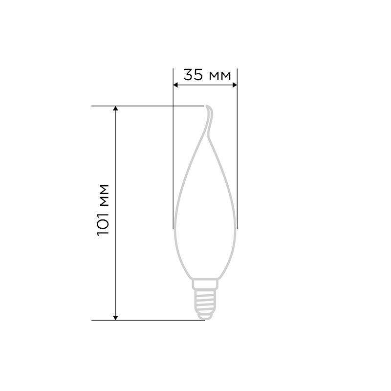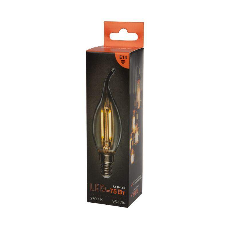 Филаментная лампа Rexant 604-109 в форме свечи на ветру CN37. Мощность 9.5Вт, световой поток 950лм. Теплый свет 2700К. Прозрачная колба. Цоколь E14. Яркая и элегантная лампа для создания романтической атмосферы.