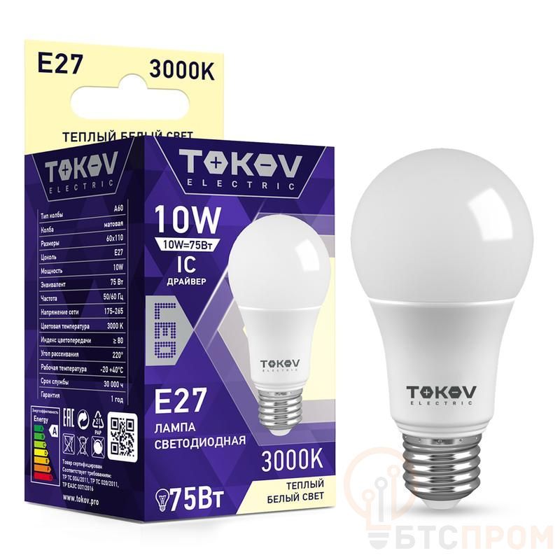 Светодиодная лампа 10Вт. Стандартная форма (А60), цоколь E27. Теплый белый свет (3000K). Напряжение 176-264В. Энергоэффективность и привычный теплый свет.