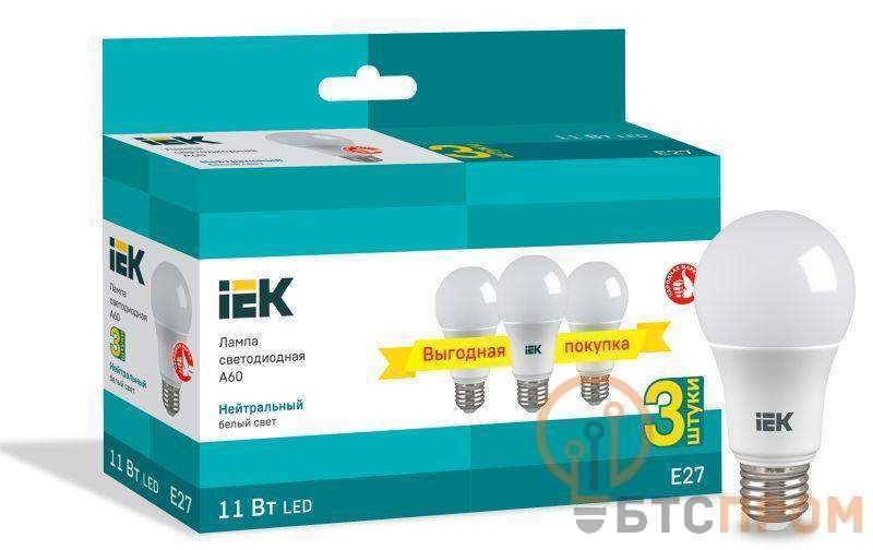 Лампа LED A60 шар 11Вт 230В 4000К E27 (3шт/упак) IEK предназначена для использования в осветительных приборах наружного и внутреннего освещения объектов промышленного, коммерческого и бытового назначения. Соответствует требованиям Технических регламентов Таможенного союза ТР ТС 004/2011, ТР ТС 020/2011, МЭК 62560, Постановления Правительства РФ от 10.11.2017 № 1356.
