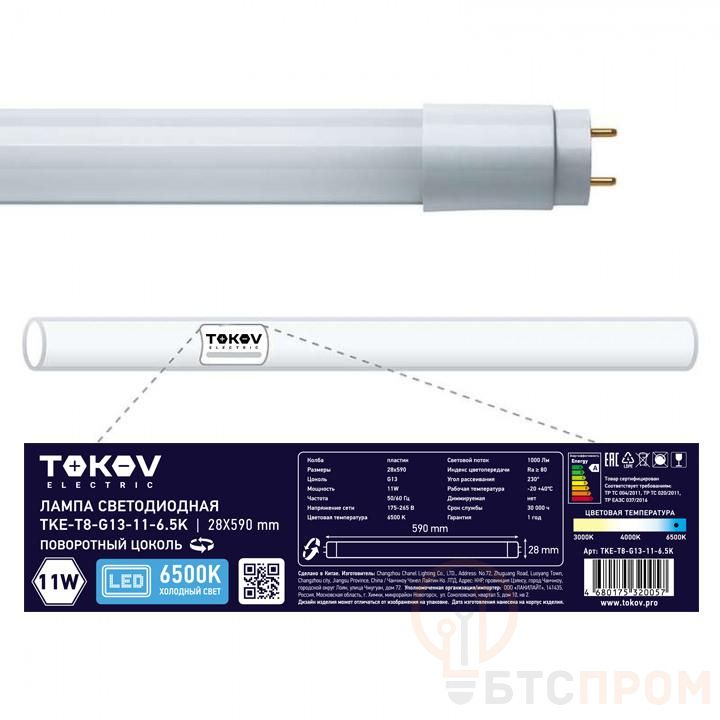 Светодиодная лампа TOKIV ELECTRIC TKE-T8-G13-11-6.5K — современная энергоэффективная замена устаревшим люминесцентным лампам. Модель мощностью 11 Вт обеспечивает яркий белый свет 6500K холодного оттенка, что соответствует естественному дневному освещению.