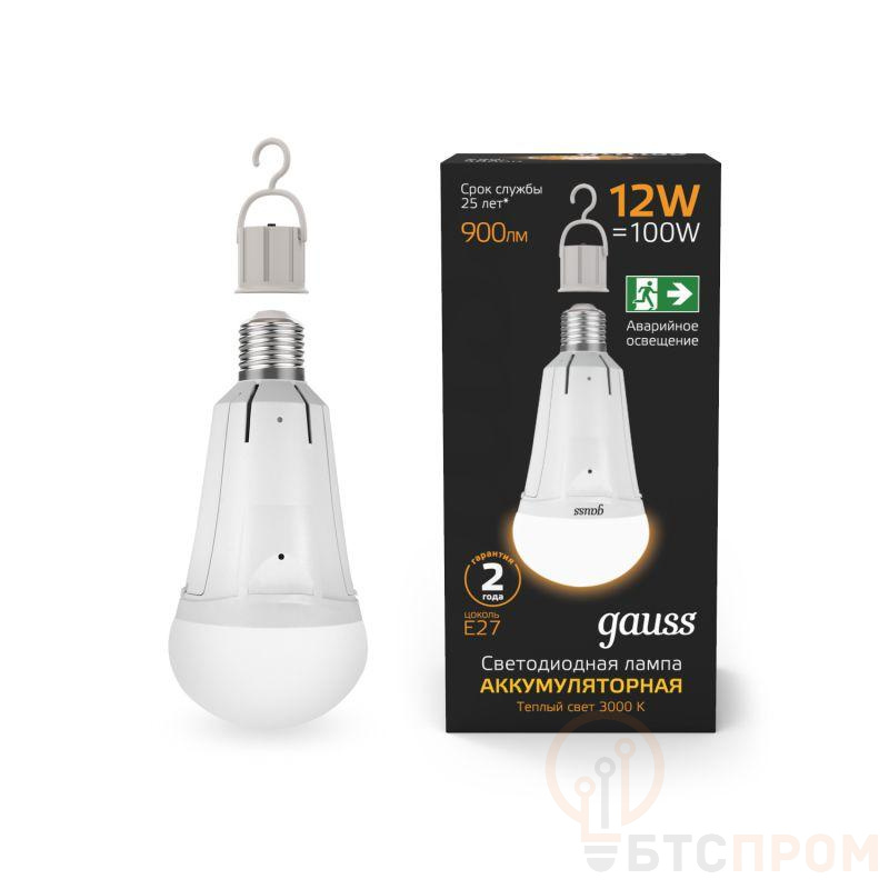 Лампа светодиодная Black 12Вт A80 грушевидная 3000К тепл. бел. E27 900лм авар. аккум. Li-Ion GAUSS 102002112