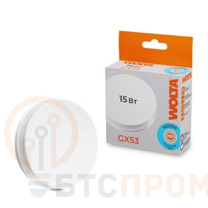 Светодиодная лампа WOLTA для точечного освещения. Мощность 15Вт, цоколь GX53, холодный белый свет (6500К). Обеспечивает яркое, сфокусированное освещение. Часто используется в коммерческих помещениях, а также в домашних условиях для подсветки функциональных зон.