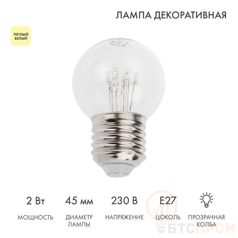 Декоративные светодиодные лампы используются с гирляндой Белт-Лайт и служат для украшения улиц, фасадов зданий и внутреннего интерьера. Ретро-лампа имитирует классический дизайн лампы накаливания, но внутри находятся энергоэффективные светодиоды. Это потрясающее сочетание винтажного облика и современных технологий. Диаметр колбы составляет 45 мм, что увеличивает площадь свечения и насыщенность светом окружающего пространства. Декоративная лампа выполнена из ударопрочного поликарбоната, обладающего высокой устойчивостью к механическим повреждениям. Благодаря использованию стандартного цоколя Е27 установка лампы является простой и быстрой процедурой, не занимающей много времени. Лампы подходят для двухжильных и пятижильных гирлянд Белт-Лайт. Используя специальный контроллер можно создавать разнообразные динамические эффекты. Полная мощность для расчета нагрузки и для подбора контроллеров составляет 2,5 ВА.
