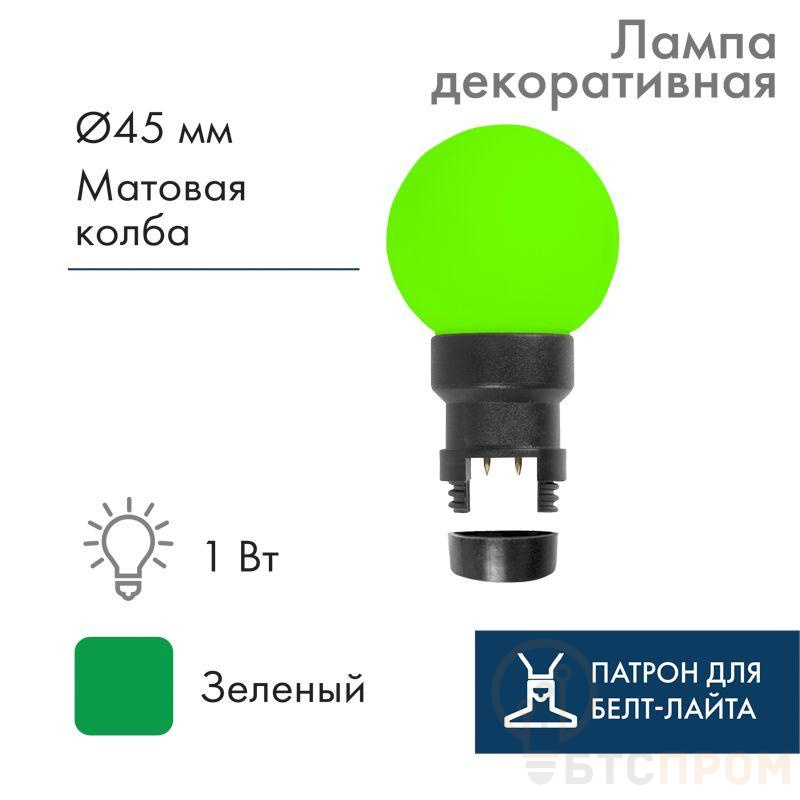 LED Лампа вместе с патроном. Колба лампы диаметром O45 мм. Монтируется с помощью шестигранного ключа Т10. Цвет свечения - Зеленый, колба выполнена в цвете свечения Подходит для двухжильного белт-лайта Номинальная мощность светодиодов составляет 1 Вт, полная мощность для выбора контроллера и расчетов при подключении составляет 6 ВА.