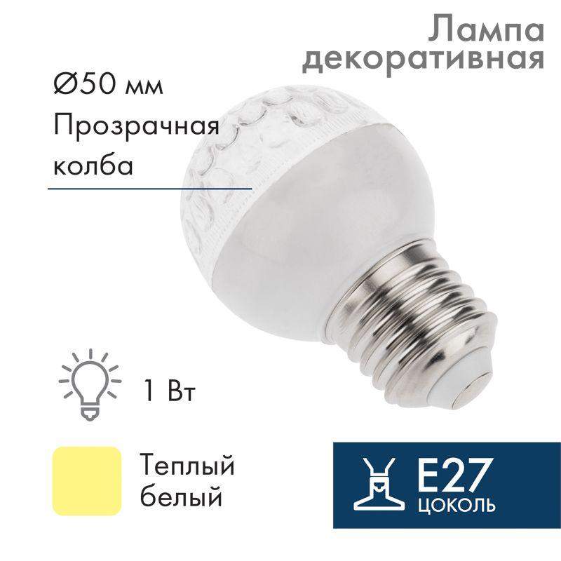 Декоративные светодиодные лампы используются с гирляндой Belt Light и служат для украшения улиц, фасадов зданий и интерьеров. Колба лампы имеет форму шара диаметром 50мм, что позволяет увеличить площадь свечения и насыщенность светом окружающего пространства. Она выполнена из ударопрочного поликарбоната. Декоративная лампа имеет стандартный цоколь Е27, при помощи которого установка является весьма простой процедурой не занимающей много времени. Суммарная мощность светодиодов составляет всего 1 Вт, что позволяет снизить затраты на электроэнергию и подключить гирлянду большей длины. Светодиодные лампы используются с гирляндами Belt Light двух или пятижильными, а при использовании специального контроллера можно создать различные динамические световые эффекты.