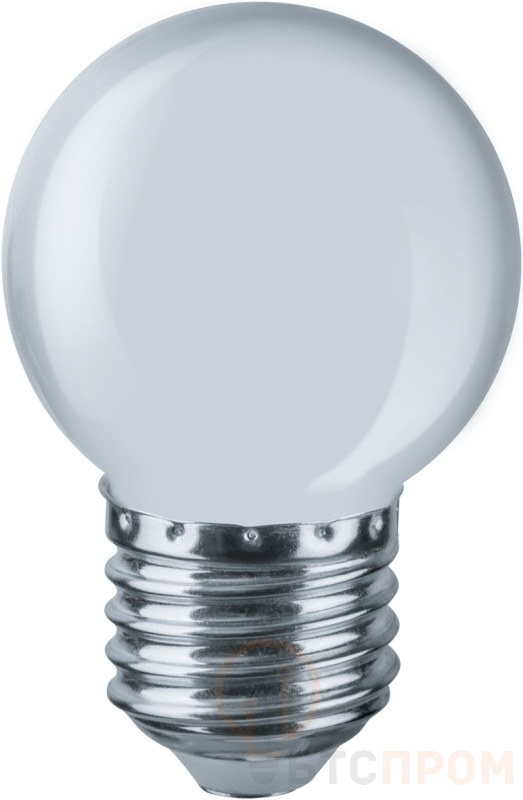 Маломощная лампа Navigator формы шара (G45). Мощность 1Вт, матовая колба, цоколь E27. Может иметь специальное назначение (например, индикаторная подсветка, ночник). Диапазон напряжений 176-264В.