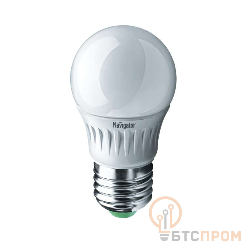 Лампа-шар Navigator (G45) малой мощности. 5Вт, матовая колба, холодный белый свет (6500К). Цоколь E27. Световой поток 425 лм. Экономичный вариант для фонового освещения.
