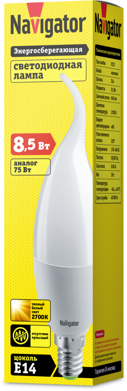 Лампа Navigator с эффектом "свечи на ветру" (FC37). Мощность 8.5Вт, теплый белый свет (2700К), цоколь E14. Световой поток 640 лм. Плавно изогнутая колба создает эффект мерцающего пламени, добавляя интерьеру романтичности и уюта. Идеальна для спален, зон релаксации, ресторанов.