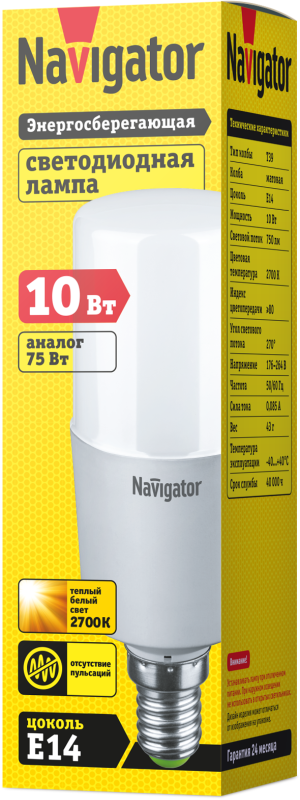 Лампа Navigator T39 с цоколем E14. Мощность 10Вт, теплый белый свет (2700К), световой поток 750 лм. Для декоративных светильников с линейными формами.