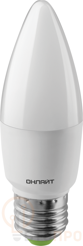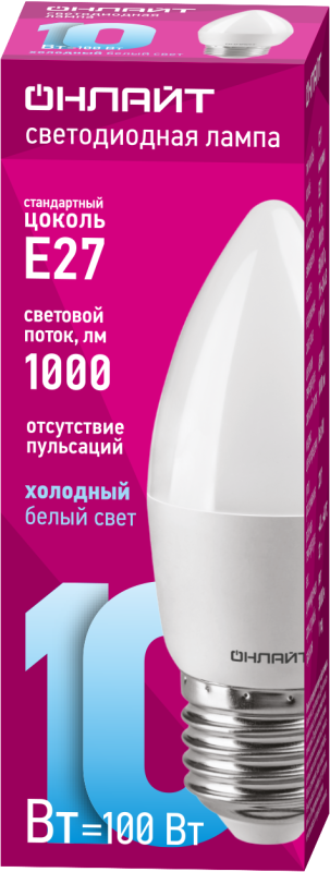 Лампа C37 с цоколем E27 и холодным светом (6500К). Мощность 10Вт.