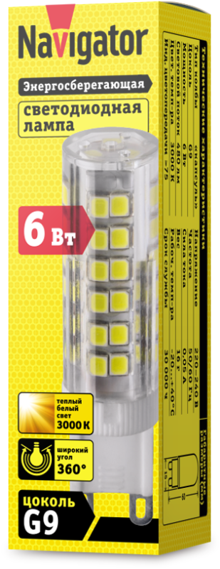 Светодиодная лампа Navigator капсульного типа с цоколем G9 и теплым белым светом 3000К повышенной мощности. Мощность 6Вт и световой поток 480 лм обеспечивают яркое и комфортное освещение для различных типов светильников. Теплый белый свет создает уютную атмосферу, способствующую релаксации. Лампа изготовлена с использованием инновационных технологий, которые обеспечивают высокую энергоэффективность и долговечность. Керамическое основание гарантирует excellent теплоотвод и защиту от перегрева. Модель отличается широким углом рассеивания - 360 градусов, что обеспечивает равномерное распределение света. Совместима с большинством светильников, разработанных для цоколя G9. Низкое энергопотребление позволяет экономить до 85% электроэнергии по сравнению с галогенными лампами. Срок службы - 30 000 часов. Гарантия - 2 года.