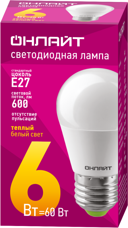 Лампа светодиодная 71 645 OLL-G45-6-230-2.7K-E27 ОНЛАЙТ 4670004716458 – лампа с шаровидной колбой, длиной 73 мм, с цоколем Е27, мощностью 6 Вт. Цветовая температура 2700 К. Дает теплый белый свет.
