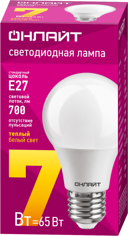 Лампа светодиодная 71 647 OLL-A60-7-230-2.7K-E27 ОНЛАЙТ 4670004716472 – лампа с шаровидной колбой, длиной 73 мм, с цоколем Е27, мощностью 7 Вт. Цветовая температура 2700 К. Дает теплый белый свет.