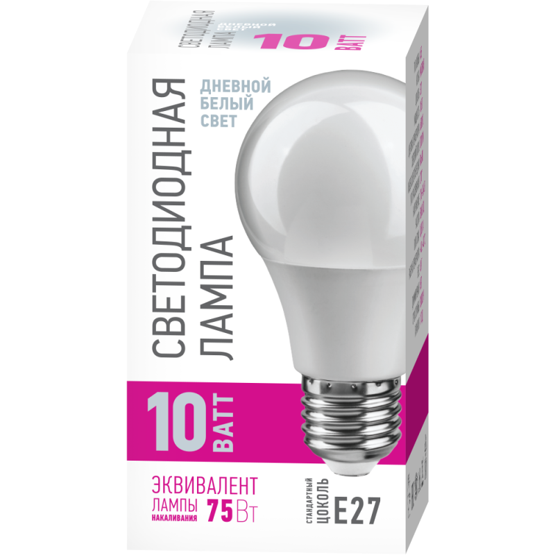 Промо-лампа формы A55. Мощность 10Вт, холодный белый свет 6500К, цоколь E27. Компактное и эффективное решение для местного освещения.