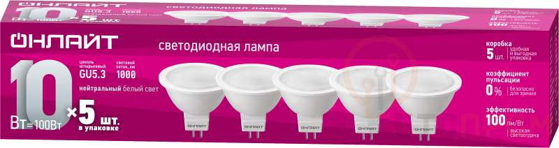Набор спотов ОНЛАЙТ MR16 с нейтральным белым светом. Мощность 10Вт, нейтральный белый свет 4000К, цоколь GU5.3. Набор из 5 ламп. Нейтральный свет обеспечивает точную цветопередачу, что важно для витрин магазинов одежды, косметики или мебели. Покупка набора из пяти одинаковых ламп упрощает проектирование и монтаж системы освещения.