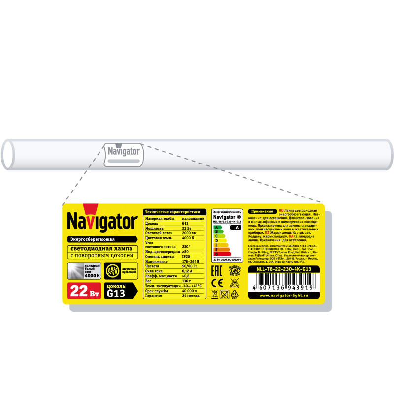 Лампа светодиодная 94 391 NLL-T8-22-230-4K-G13 22Вт линейная 4000К нейтр. бел. G13 2000лм 176-264В поворотн. Navigator 94391
