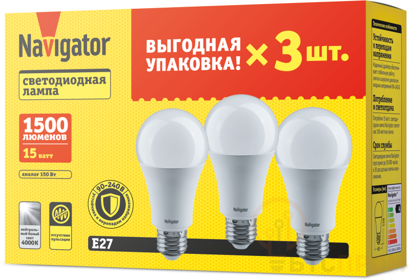 Набор ламп NAVIGATOR A60 с нейтральным светом повышенной мощности. Мощность 15Вт, нейтральный белый свет 4000К, цоколь E27. Профессиональное решение для освещения коммерческих помещений средней площади.