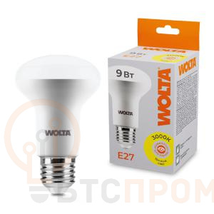 Лампа WOLTA в форме груши. Мощность 9Вт, теплый белый свет 3000К, цоколь E27. Оптимальное сочетание мощности и световой отдачи для большинства бытовых светильников.