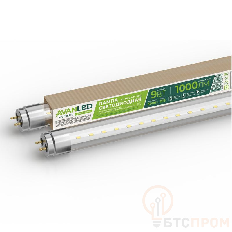 Лампа светодиодная AL T8-9-830-600 9Вт прозрачная 3000К тепл. бел. G13 1000лм 195-265В (пр-во РФ) AVANLED 11206301