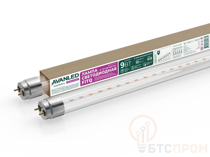 Светодиодная лампа для растений AVANLED 12206011. Линейная форма T8, длина 600мм, мощность 9Вт, цоколь G13. Спектр красный/синий (BR). Подходит для досветки растений на стеллажах, подоконниках, в мини-теплицах. Компактный размер и эффективное светораспределение.