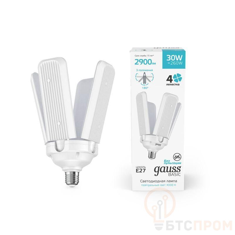 Мощная светодиодная лампа Gauss 11732232. Форма "клевер-4", 30Вт. Нейтральный белый свет 4000K. Цоколь E27. Световой поток 2900 лм. Подходит для освещения больших помещений: гостиных, залов, ресторанов. Стильный дизайн и высокая эффективность.