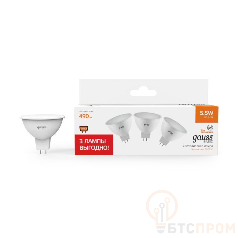 Светодиодная лампа Gauss 10135162T Basic. MR16, 5.5Вт. Теплый белый свет 3000K. Цоколь GU5.3. Световой поток 490 лм. Поставляется в упаковке 3 шт. Идеальна для точечного освещения, акцентной подсветки в интерьере. Низкое энергопотребление.