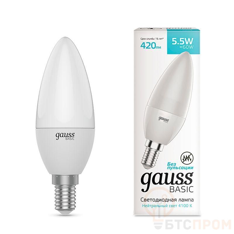 –Лампа светодиодная Basic 5.5Вт свеча 4000К нейтр. бел. E14 410лм GAUSS 1033126