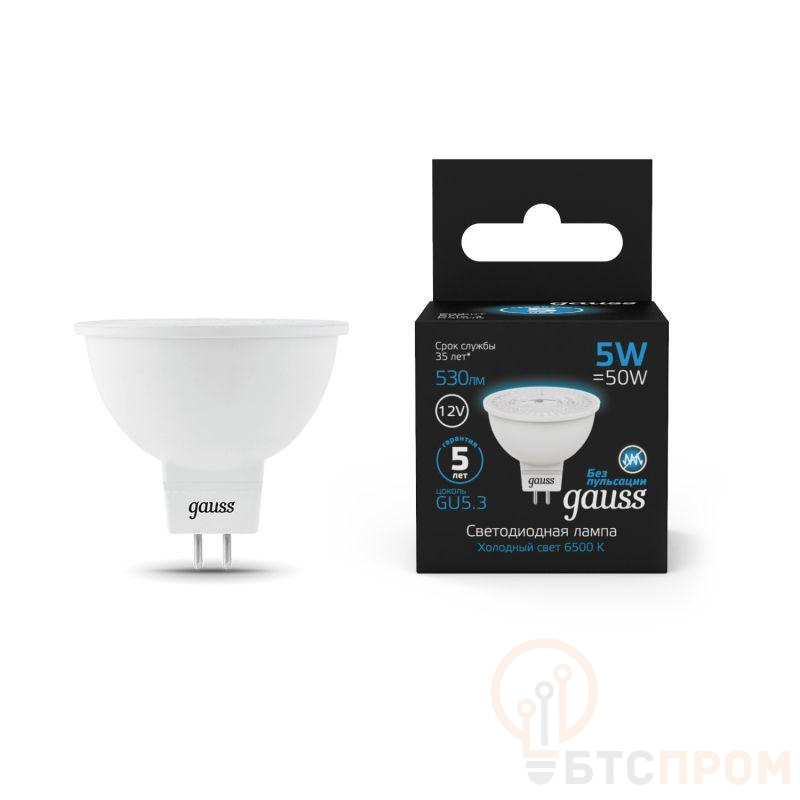 –Лампа светодиодная Black 5Вт MR16 софит 6500К холод. бел. GU5.3 530лм DC 12В GAUSS 201505305