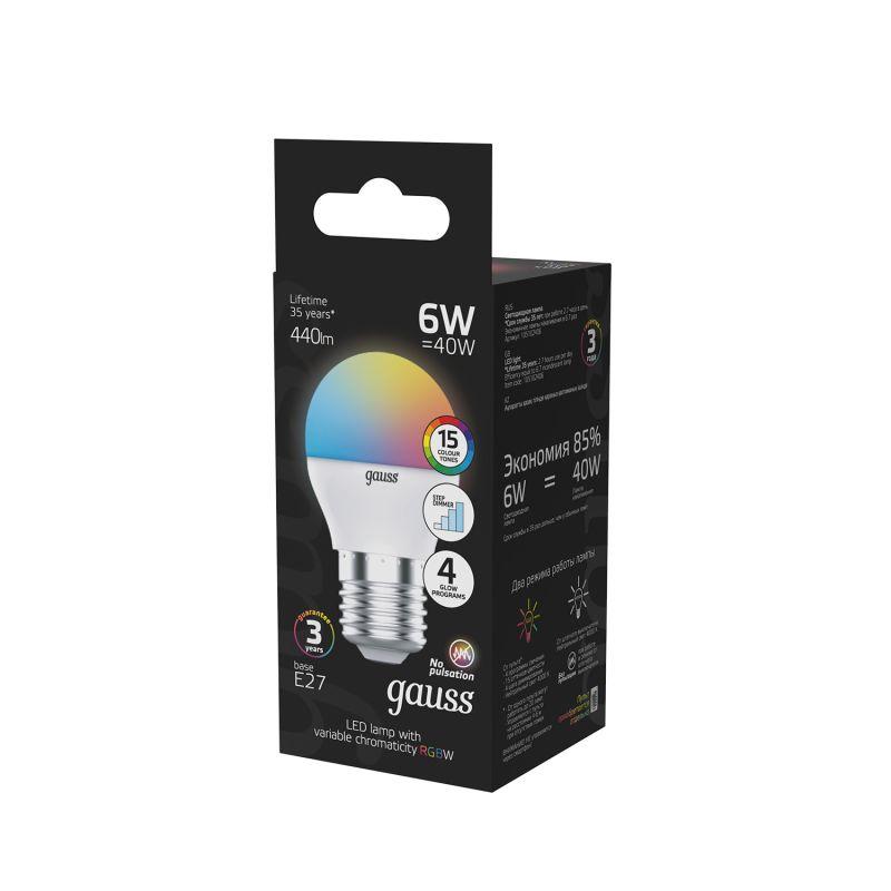 Светодиодная лампа GAUSS Black 6Вт G45 — это современное решение для создания умного освещения в вашем доме. Лампочка формата «шар» с цоколем E27 поддерживает технологию RGBW, позволяя выбирать из миллионов оттенков цвета, а также теплый, нейтральный или холодный белый свет для создания идеальной атмосферы в любое время суток.