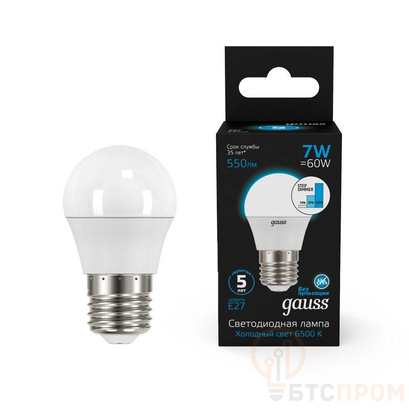 Лампа светодиодная Black 7Вт P45 шар 6500К холод. бел. E27 550лм шаг. диммир. GAUSS 105102307-S