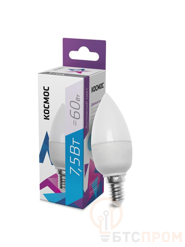 Лампа светодиодная КОСМОС LkecLED7.5wCNE1465. Мощность 7.5Вт. Напряжение 220В. Цоколь E14. Холодный белый свет 6500K. Компактное решение для дополнительного освещения. Экономия энергии до 85%.
