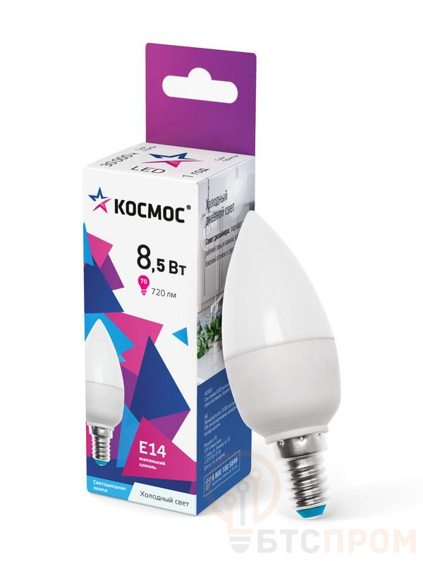 Светодиодная лампа КОСМОС в форме свечи с цоколем E14 и холодным белым светом 6500К. Мощность 8.5Вт создает яркое и интенсивное освещение для декоративных светильников. Холодный белый свет способствует повышению продуктивности и концентрации внимания. Лампа изготовлена с использованием качественных светодиодов, которые гарантируют стабильную работу и длительный срок службы. Совместима с большинством светильников, разработанных для цоколя E14. Средний срок службы - 30 000 часов. Гарантия - 2 года.