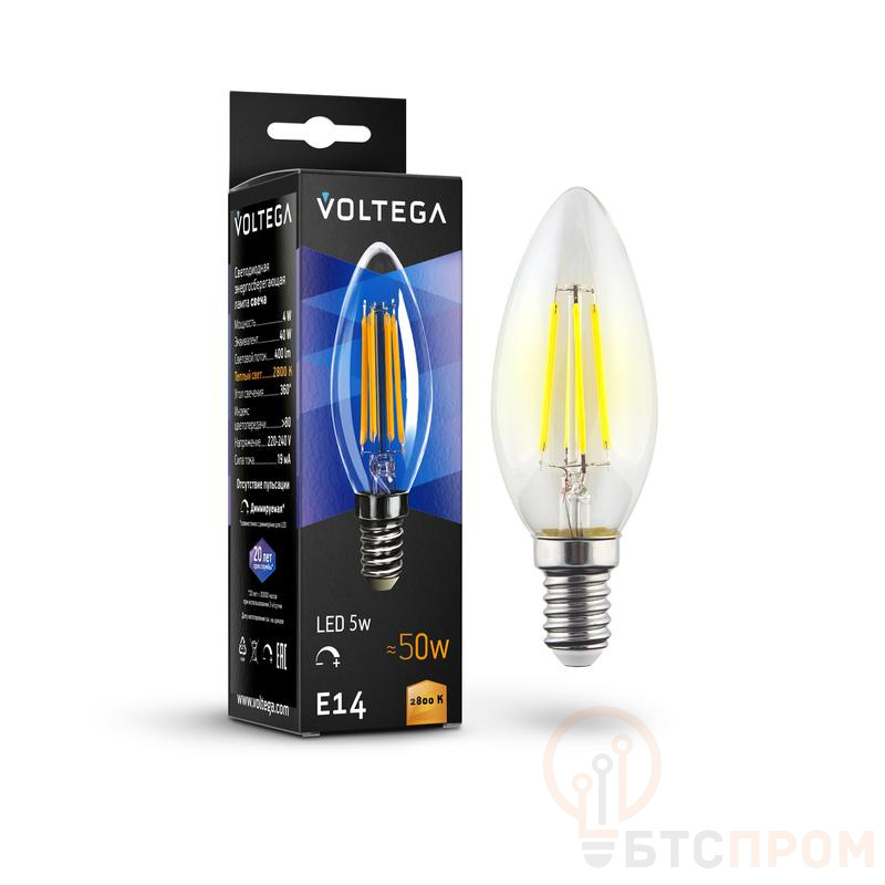 Светодиодная лампа Voltega 8460 Crystal. Форма Candle, 5Вт. Теплый белый свет 2800K. Цоколь E14. Диммируемая. Декоративное освещение с регулируемой яркостью. Для спален, гостиных, ресторанов.