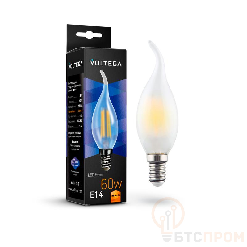 Светодиодная лампа Voltega 7025 Crystal Candle wind matt. 6Вт. Теплый белый свет 2800K. Цоколь E14. Матовая колба с декоративной формой. Мягкий свет без слепящего эффекта. Для спален и зон отдыха.
