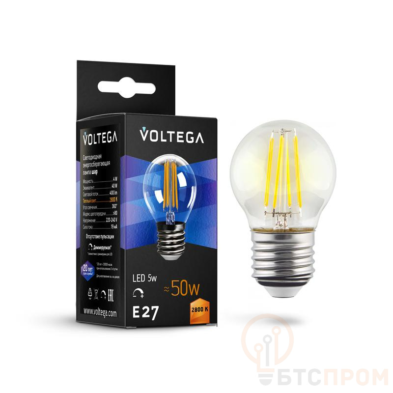 Лампа светодиодная Voltega 8466 Crystal Globe. 5Вт. Теплый белый свет 2800K. Цоколь E27. Диммируемая. Декоративное освещение с возможностью регулировки яркости. Для создания атмосферы в интерьере.